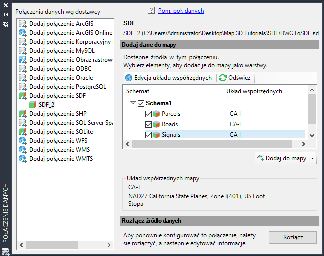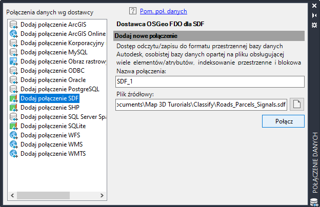 - W kategorii Połączenia danych wg dostawcy wybierz opcję Dodaj połączenie SDF.