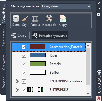 Na karcie Menedżer wyświetlania nowa warstwa ma nazwę Działki.