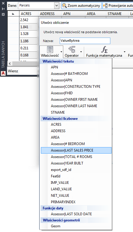 Dane właścicieli zostały połączone w warstwie Działki, a wyniki zostały zapisane w nowej składnicy danych. Połączone informacje można wykorzystać w celu utworzenia obliczonej właściwości. Obliczenia właściwości są wynikiem wyrażenia: w tym przypadku jest to ostatnia cena sprzedaży podzielona przez obszar działki.