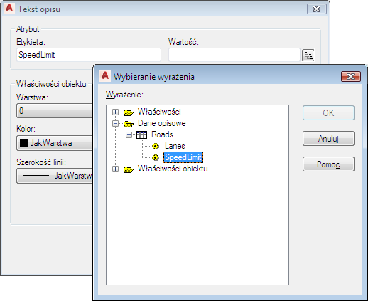 Jeśli rysunek zawiera dane obiektów lub jest połączony z danymi zewnętrznymi, można określić właściwości tych danych jako wartości dla opisu. Te właściwości są dynamiczne. Po dołączeniu opisu do obiektów dla każdego opisu jest wyświetlana odnosząca się do niego wartość tej właściwości.