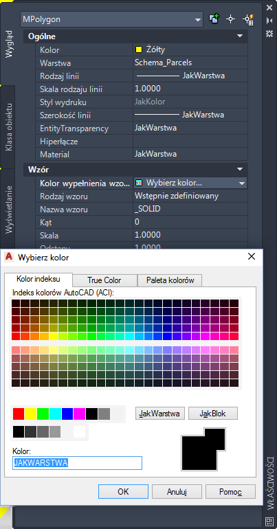Zmień kolor wypełnienia wszystkich obiektów w klasie Parcels, korzystając z palety Właściwości.