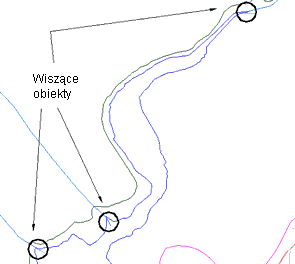 Element wiszący jest często efektem niedokładnie przeprowadzonej digitalizacji, gdzie obiekt zostaje przeciągnięty poza punkt przecięcia z obiektem docelowym. Użyj opcji Przerwij przecinające się obiekty przed zastosowaniem opcjiWymaż elementy wiszące.