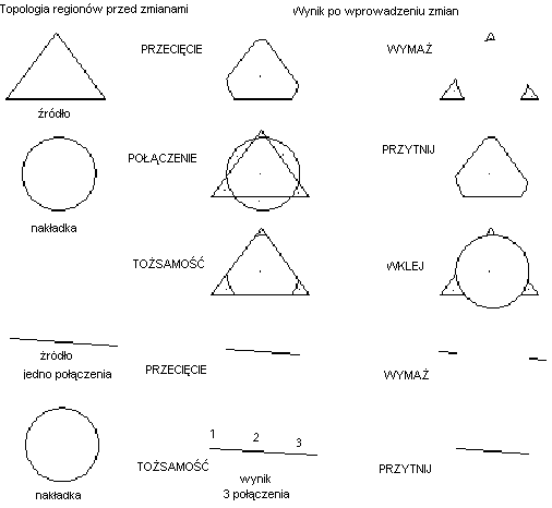 Operacje tożsamości działają podobnie jak Suma na topologii źródłowej i podobnie jak Iloczyn na topologii nakładanej. Operację Tożsamość należy wykonać, by połączyć węzły, łamane lub regiony z regionami i zachować obiekty zawierające się wewnątrz geometrii źródłowej. Operacja Tożsamość tworzy topologię z jedną łamaną, tam gdzie łamana biegnie przez topologię nakładaną.
