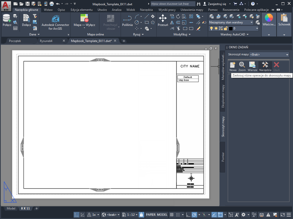Po zdefiniowaniu szablonu skoroszytu mapy i zapisaniu mapy można opublikować skoroszyt mapy do plotera lub do pliku DWF.