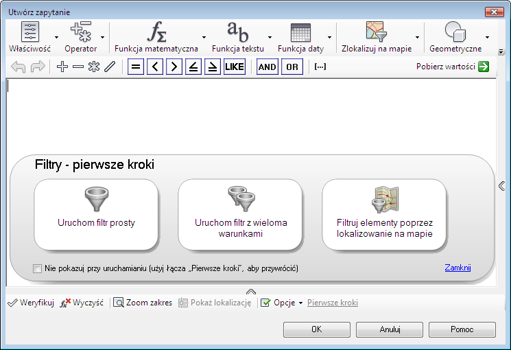 Podczas pracy z podzestawami danych można stosować filtry. Na przykład jeśli na mapie uwzględnione są wszystkie miasta w województwie śląskim, można utworzyć filtr wyświetlający tylko miasta o zaludnieniu przekraczającym 50 000 osób. Za pomocą wyrażeń można: |