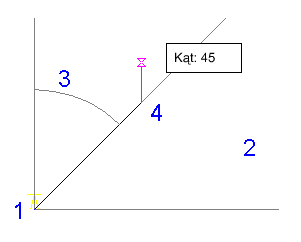 , aby określić kąt na mapie. Użyj odpowiednich jednostek kąta — dziesiętnych, np. 45.1111, albo geodezyjnych, np. N 45d3'55" E.