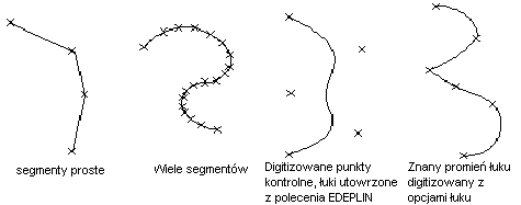 - Jednak, bez względu na to jak bardzo dokładnie będą przerysowywane elementy mapy, niektóre dane zostaną utracone. Ostre krzywe wymagają digitalizacji większej ilości punktów, aby zapewnić linii możliwie wysoką dokładność; jednakże przy zwiększaniu dokładności, rośnie złożoność i rozmiar pliku. Jeśli znane są parametry użyte do zdefiniowania krzywej regularnej, takie jak promień lub cięciwa, należy użyć do digitalizacji opcji Łuk poleceń PLINIA i MAPDIGITIZE. Linie o nieregularnych kształtach, takie jak warstwice, powinny być poliliniami ciągłymi. Jeśli jest to konieczne, można je wygładzić opcją Dopasuj polecenia EDPLIN. Aby wszystkie kreskowe rodzaje linii były poprawnie przetwarzane, przed digitalizowaniem należy ustawić zmienną systemową PLINEGEN na 1 (tak).