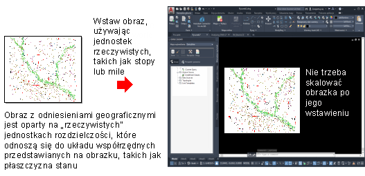 Poniższy przykład przedstawia zależność między jednostkami rozdzielczości, a obrazem z odniesieniem geograficznym. Ze względu na brak określonej skali papieru należy wstawić obraz używając jednostek, które przedstawia obraz (na przykład metrów lub kilometrów). Skalowanie obrazu podczas wstawiania nie jest konieczne.