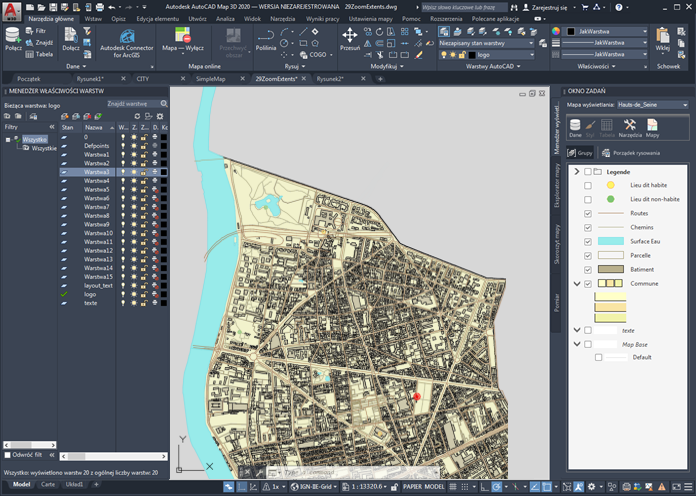 Ta mapa zawiera zarówno warstwy programu AutoCAD (po lewej), jak i warstwy Menedżera wyświetlania (po prawej).
