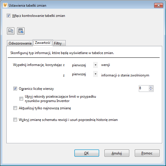 W przypadku pracy ze zmianami możliwe jest posiadanie kilku wersji rysunku w ramach jednej zmiany. Na karcie Zawartość można określić, czy w tabelce zmian mają być wyświetlane dane pierwszej wersji zmiany czy ostatniej wersji zmiany.