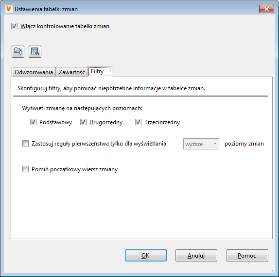 W oknie dialogowym Ustawienia tabelki zmian wybierz kartę Filtry.