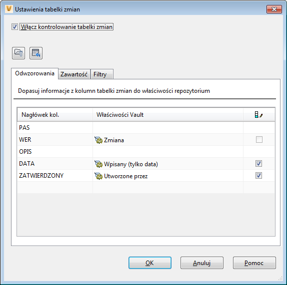Karta Odwzorowania | Na karcie Odwzorowania można odwzorować właściwości programu Vault na kolumny tabelki zmian. ![]() |