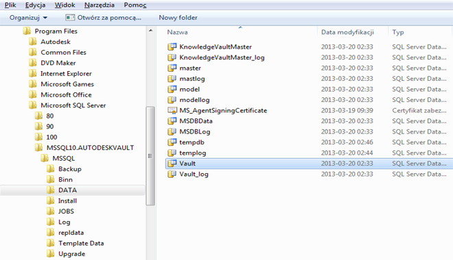 Po zainstalowaniu programu Autodesk Vault zostanie utworzone pojedyncze repozytorium o nazwie Vault. Pliki bazy danych dla repozytorium są tworzone w folderze MSSQL$AUTODESKVAULT\Data, w folderze instalacyjnym programu Microsoft SQL Server.
