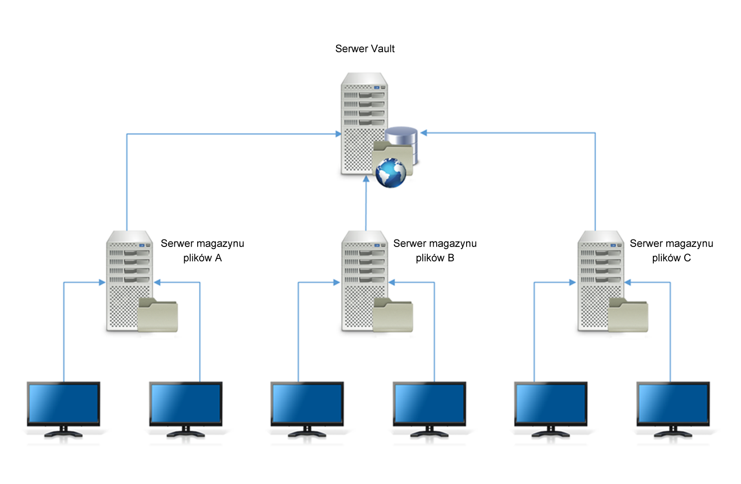 Pierwszy z nich polega na scentralizowaniu bazy danych dla wszystkich witryn. Bazę danych dla programu Vault można umieścić na oddzielnym serwerze, co przedstawiono na poniższej ilustracji.