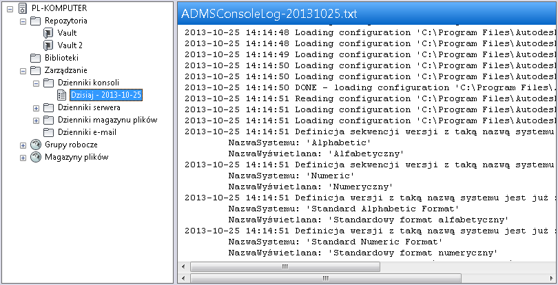 W programie ADMS Console można wyświetlać dzienniki konsoli, serwera, magazynu plików i poczty e-mail.