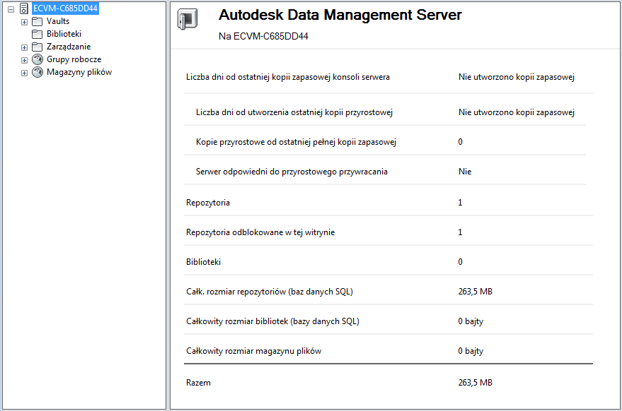 Można wyświetlić szczegółowe informacje dotyczące wybranego programu Vault Server, w tym liczbę dni od ostatniego wykonania kopii zapasowej konsoli serwera, liczbę włączonych repozytoriów i liczbę bibliotek.