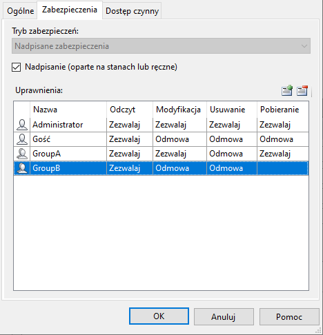 - Jeśli członek występuje w dwóch różnych grupach i uprawnienia na poziomie zabezpieczeń opartych na obiektach są w jednej grupie ustawione na Brak, ale w innej grupie na Zezwalaj, czynnym uprawnieniem członka na poziomie zabezpieczeń opartych na obiektach jest Zezwalaj.