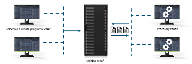 Job Processor — oddzielna aplikacja, która rezerwuje zadania w kolejce i pobiera je z serwera zadań w celu przetwarzania. Narzędzie Job Processor jest instalowane razem z klientem programu Vault, więc do przetwarzania zadań można używać dowolnej stacji roboczej z programem Autodesk Vault Professional.