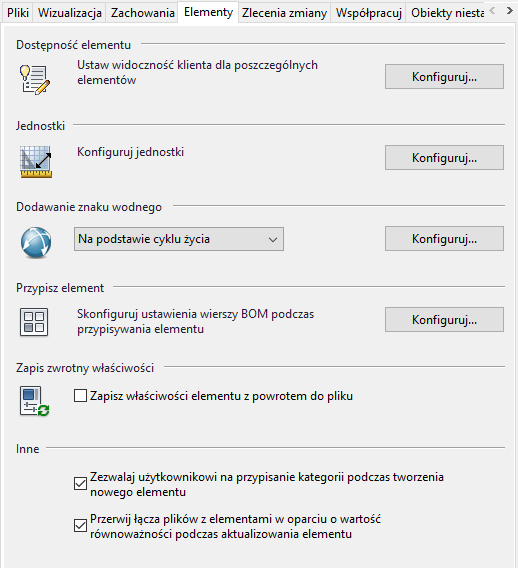 Karta Elementy w oknie dialogowym Ustawienia programu Vault zawiera opcje dotyczące konfigurowania jednostek miar, zarządzania preferencjami znaków wodnych, konfigurowania ustawień wierszy zestawienia komponentów i umożliwiania elementom zapisanie właściwości z powrotem do skojarzonych plików. Można również wyłączyć opcję Elementy.