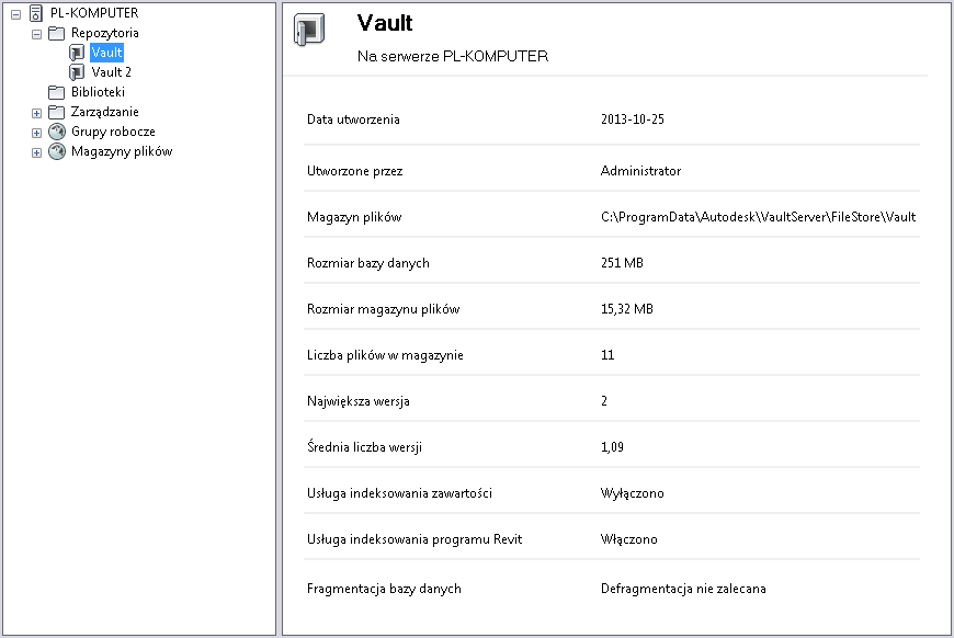 - całkowitą ilość miejsca zajmowaną przez bazę danych repozytorium