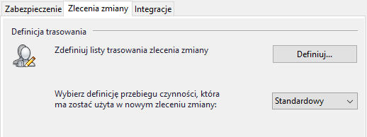 Na karcie Zlecenia zmiany w oknie dialogowym Ustawienia globalne można edytować listy kolejności operacji i definicje procesu roboczego.