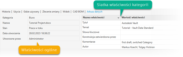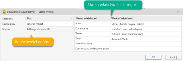Siatka właściwości ogólnych ma definicje statyczne, etykietę i elementy sterujące powiązane z właściwością programu Vault, zapisane w pliku definicji okna dialogowego. Siatka dynamiczna jest pustym obiektem siatki, który automatycznie dodaje etykiety i pola wartości poprzez wybór kategorii elementu (Plik, Folder, Obiekt niestandardowy). Te dwie siatki są podstawowymi elementami w oknie tworzenia/edycji arkuszy danych (zobacz rysunek powyżej) i arkuszach danych na kartach szczegółów:
