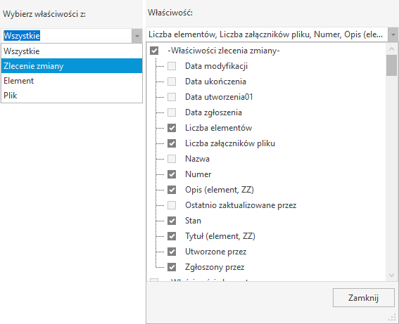 Na liście rozwijanej Właściwość zaznacz pole wyboru dla właściwości, które chcesz wyświetlić w treści wiadomości e-mail, a następnie kliknij przycisk Zamknij. Wybrane właściwości zostaną wyświetlone w sekcji Uwzględnij te wybrane właściwości.