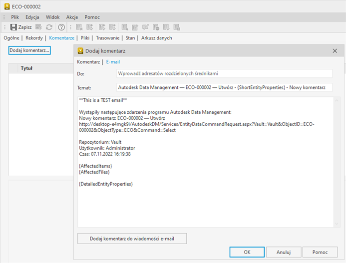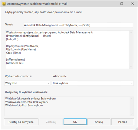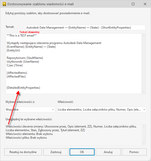 Nowy atrybut właściwości {DetailedEntityProperties} zostanie dodany do treści wiadomości e-mail poniżej elementów {AffectedItems} i {AffectedFiles}. Można skopiować i wkleić element {DetailedEntityProperties}, aby umieścić go innej sekcji treści wiadomości e-mail.