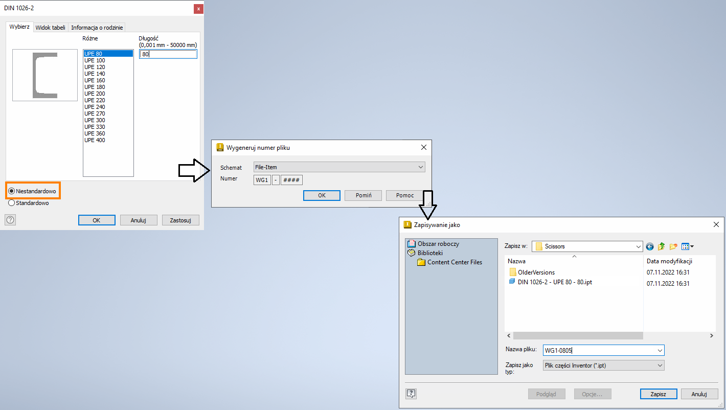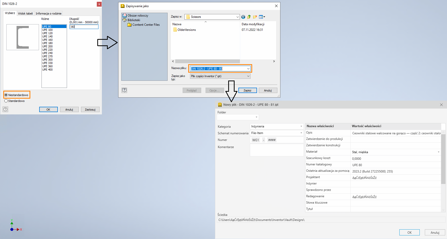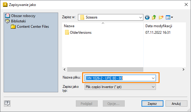 Podczas dodawania części z biblioteki Content Center jako części niestandardowej numerowanie plików programu Vault i zapisywanie w nim danych są domyślnie wyłączone. Niestandardowy komponent CC można zapisać w ścieżce projektu. Brak numeracji plików i interakcji VDS.