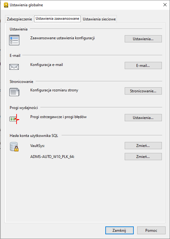 Progi ostrzegawcze i progi błędów | Umożliwia skonfigurowanie progów wydajności. |