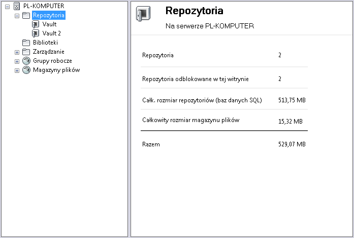 Zostanie wyświetlona zbiorcza statystyka serwera repozytorium. Obejmuje ona: