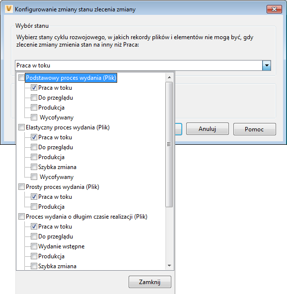 Można ograniczyć zmienianie stanu Praca zlecenia zmiany, o ile jej rekordy elementu i pliku nie znajdują się w wybranych stanach cyklu roboczego.