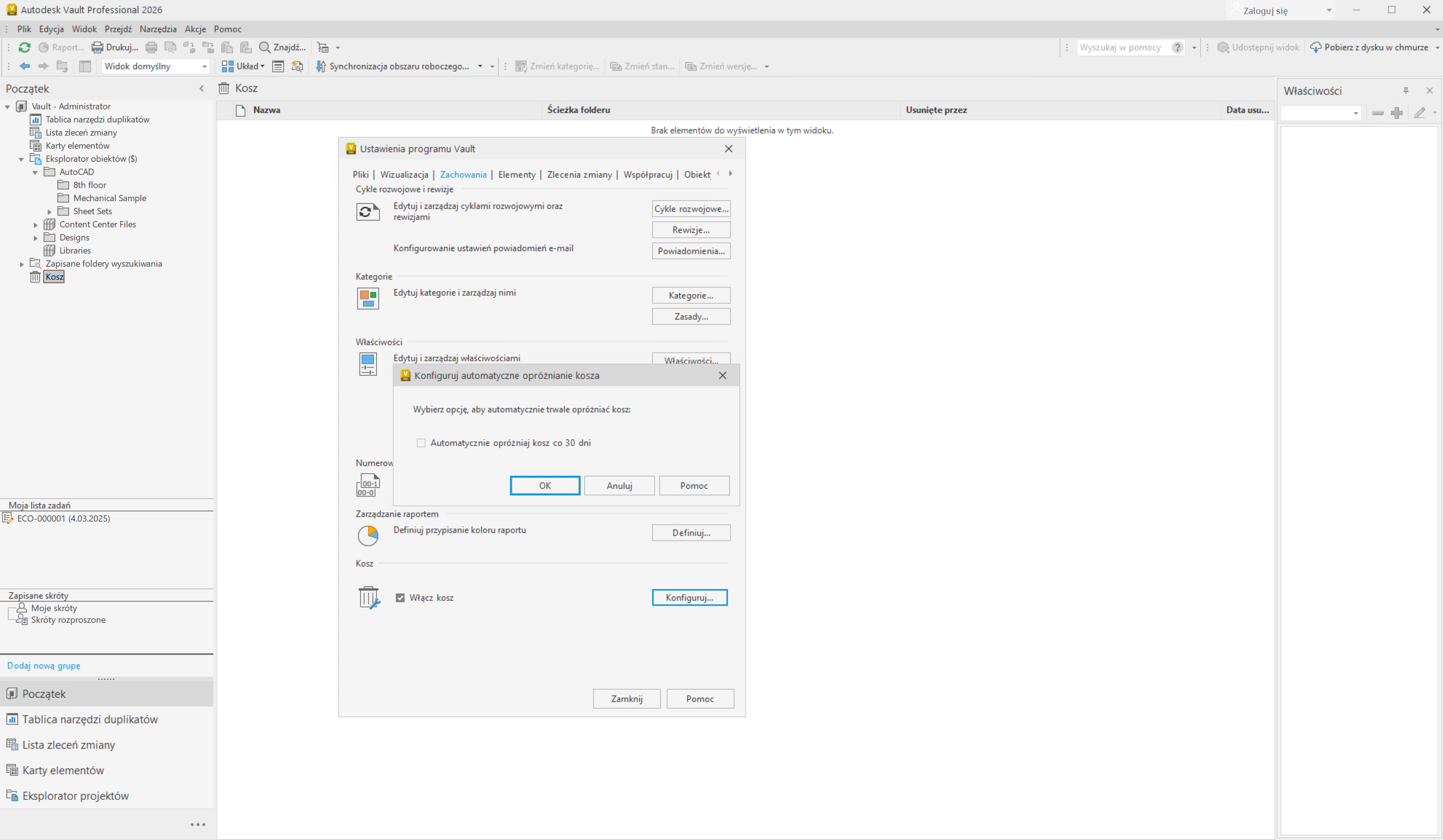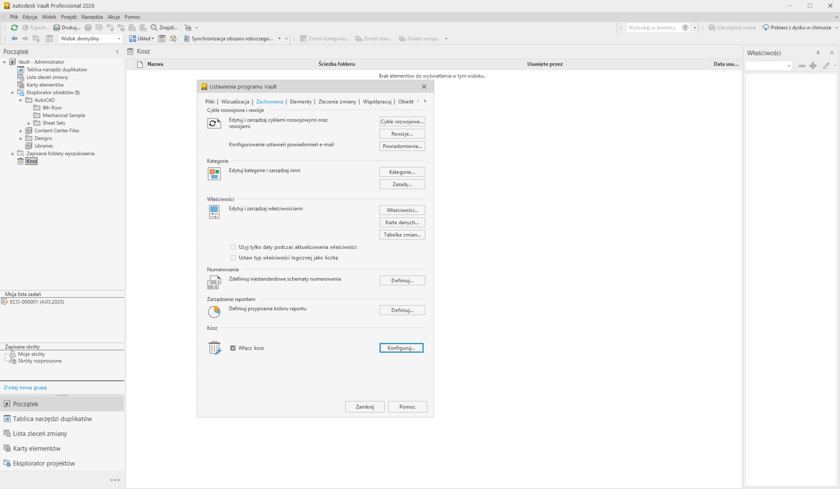Jako administrator możesz włączyć lub wyłączyć funkcję Kosza na karcie Ustawienia programu Vault > Zachowanie. Po wyłączeniu funkcji kosza proces roboczy Usuń powróci do trwałego usuwania pliku lub folderu.