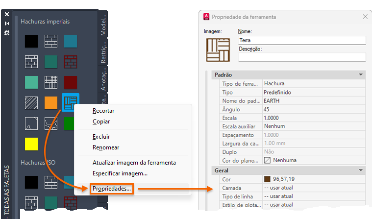 Quando uma ferramenta for adicionada a uma paleta de ferramentas, você poderá alterar as propriedades padrão. Por exemplo, é possível alterar a escala de inserção de um bloco ou a camada de um padrão de hachura.