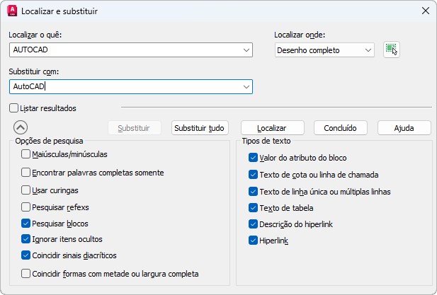 A configuração Localizar onde controla onde se deve encontrar e substituir texto em todo o desenho, texto no objeto ou objetos no momento selecionados.