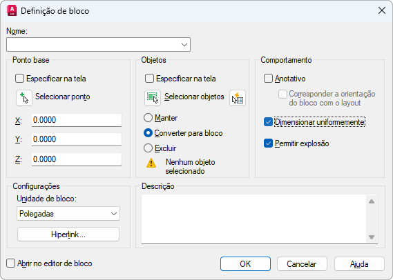 Converte os objetos selecionados em uma instância do bloco no desenho após a criação do bloco.