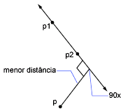 Determina a menor distância entre o ponto p e a linha que passa pelos pontos p1 e p2.
