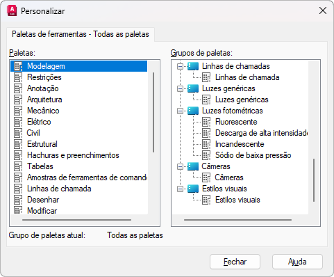 A janela Paletas de ferramentas exibe todas as paletas de ferramentas disponíveis e permite criar e gerenciar grupos delas.