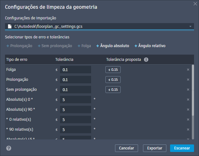 A caixa de diálogo Configurações de limpeza da geometria permite personalizar quais erros de geometria são localizados, definir valores de tolerância para cada tipo de erro e gerenciar templates de configurações. As configurações são salvas no perfil do usuário e podem ser importadas ou exportadas como arquivos .gcs para uso futuro.