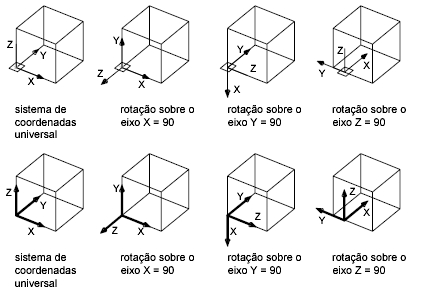 Qualquer UCS pode ser definido, especificando uma origem e uma ou mais rotações ao redor dos eixos X, Y ou Z.