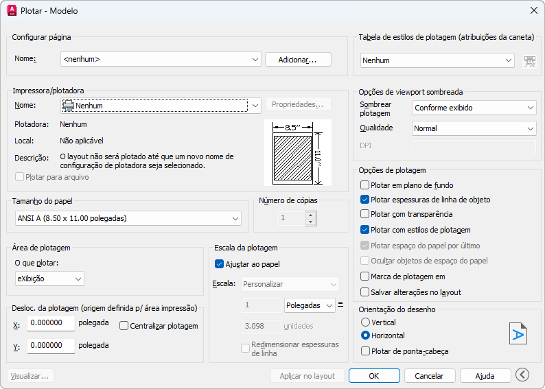 Selecione o tamanho do papel, a área de plotagem, a escala de plotagem, a orientação e outras opções.