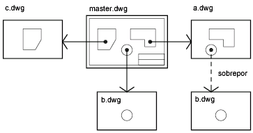 Na ilustração a seguir, muitas pessoas estão trabalhando em desenhos referenciados por master.dwg. A pessoa que está trabalhando em a.dwg precisa ver o trabalho que está sendo concluído pela pessoa que está trabalhando em b.dwg, mas não quer fazer refex a b.dwg porque apareceria duas vezes em master.dwg. Ao contrário, a pessoa sobrepõe b.dwg, que não está incluída quando a.dwg é referenciado por master.dwg.