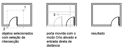 Um exemplo prático é o de mover uma porta para uma parede. A porta na ilustração está completamente contida na seleção por intersecção, enquanto as linhas da parede somente estão parcialmente na área de seleção por intersecção.