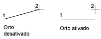 Na ilustração, uma linha é desenhada com o uso do modo Orto. O ponto 1 é o primeiro ponto especificado e o ponto 2 é a posição do cursor quando o segundo ponto é especificado.