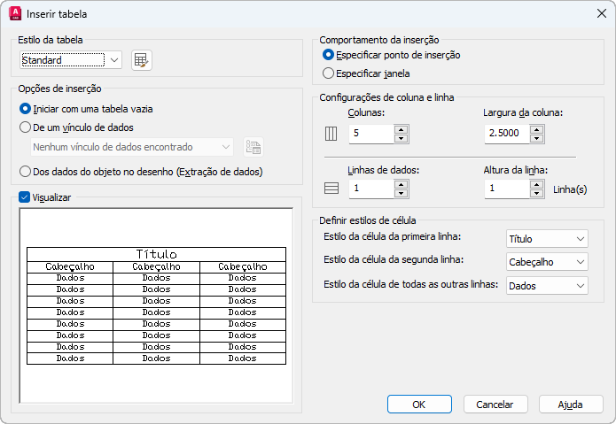 Insere uma tabela vazia no desenho.