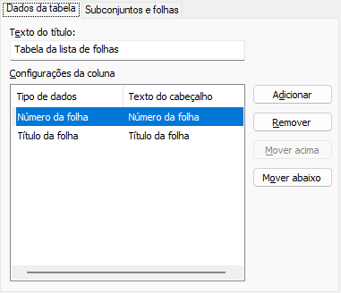 Guia Dados da tabela (caixa de diálogo Conteúdo da lista de folhas)