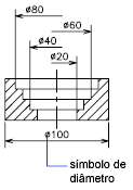 As configurações das unidades primárias controlam a exibição dos valores de cota, incluindo o formato da unidade, a precisão numérica e o estilo do separador decimal. Por exemplo, você pode inserir um símbolo de diâmetro como prefixo, como é mostrado na ilustração. Qualquer prefixo que você especifica substitui os prefixos normalmente usados para cotas de diâmetro e raio (unicode 2205 e R, respectivamente).