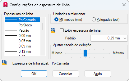 Define a espessura atual de linha, define as unidades de espessura de linha, controla a exibição e exibe a escala da espessura de linha, e define o valor DEFAULT da espessura de linha para camadas.