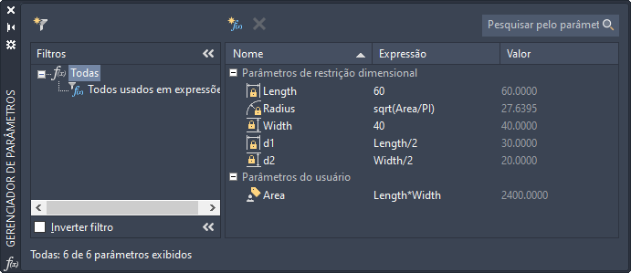 As restrições de cota Comprimento e Largura são definidas como constantes. As restrições d1 e d2 são expressões simples que referenciam Comprimento e Largura. O parâmetro de restrição de cota Raio é definida como uma expressão que inclui a função de raiz quadrada, parênteses para determinar a precedências das operações, a variável do usuário Área , o operador de divisão e a constante PI. Estes parâmetros podem ser acessados no Gerenciador de parâmetros.
