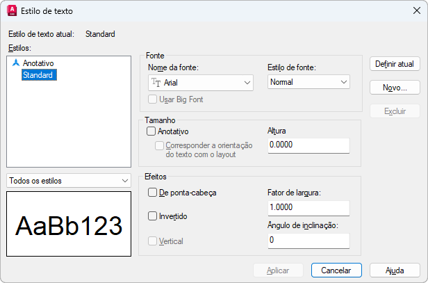Define a altura do texto com base no valor digitado. Inserir uma altura maior do que 0.0 define automaticamente a altura do texto para este estilo. Se inserir 0.0, a altura do texto padronizará para a última altura usada ou para o valor armazenado no arquivo do template do desenho.